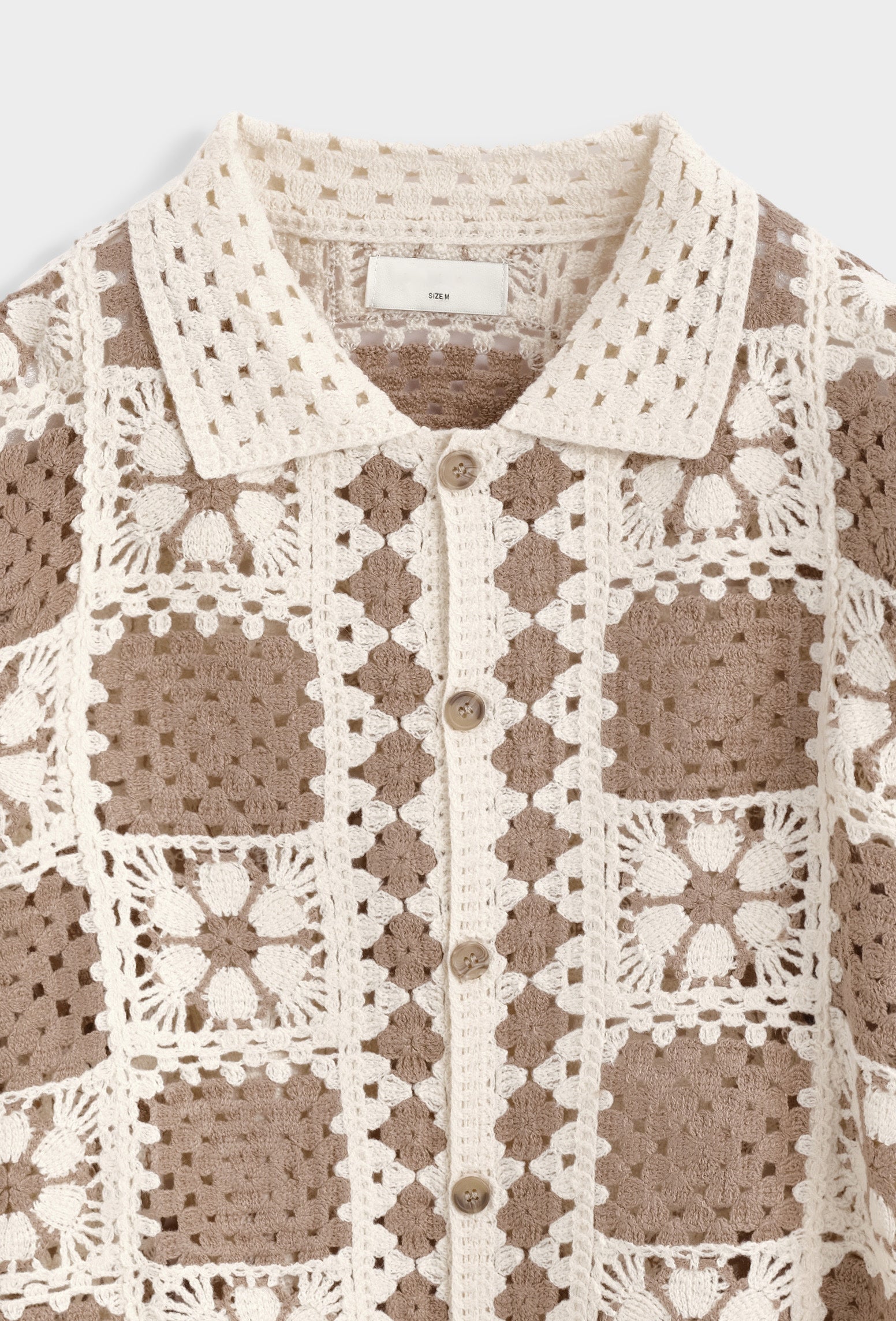 Un capo unico che unisce artigianalità e stile contemporaneo. Realizzata in lavorazione crochet effetto patchwork, alterna motivi floreali e geometrici in tonalità neutre beige e panna, per un look vintage e raffinato.