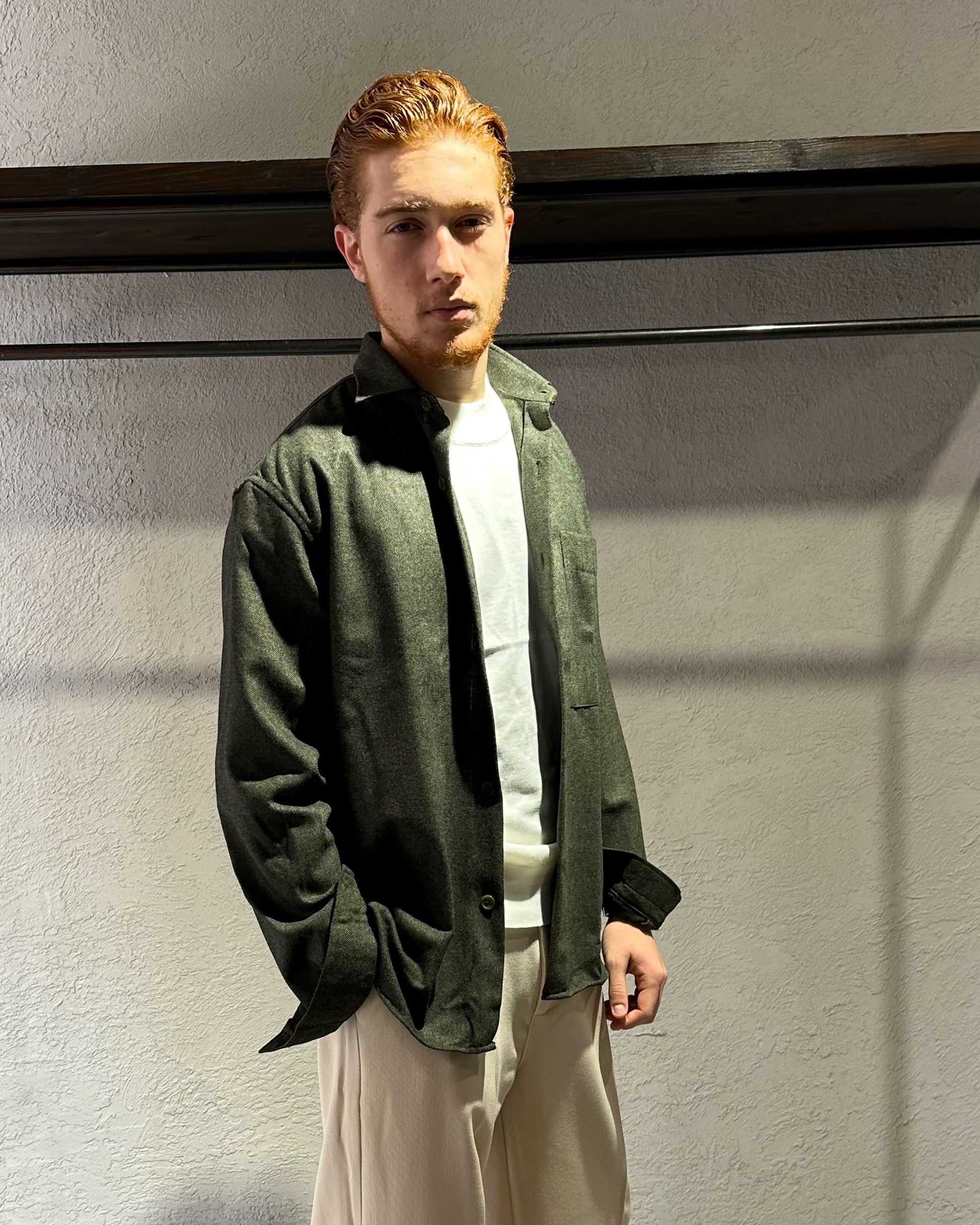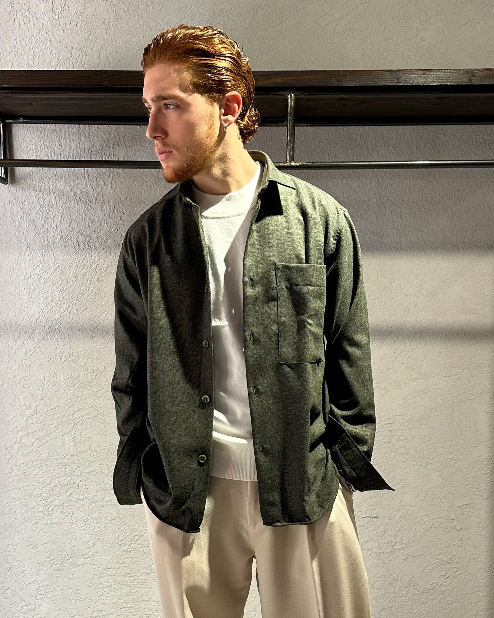 Camicia dal taglio over realizzata in flanella morbida e calda, caratterizzata da una delicata trama spigata che aggiunge profondità e texture al tessuto. Il design essenziale con colletto classico, taschino applicato sul petto e chiusura con bottoni tono su tono la rende un capo versatile, perfetto da indossare sia come camicia che come overshirt.
