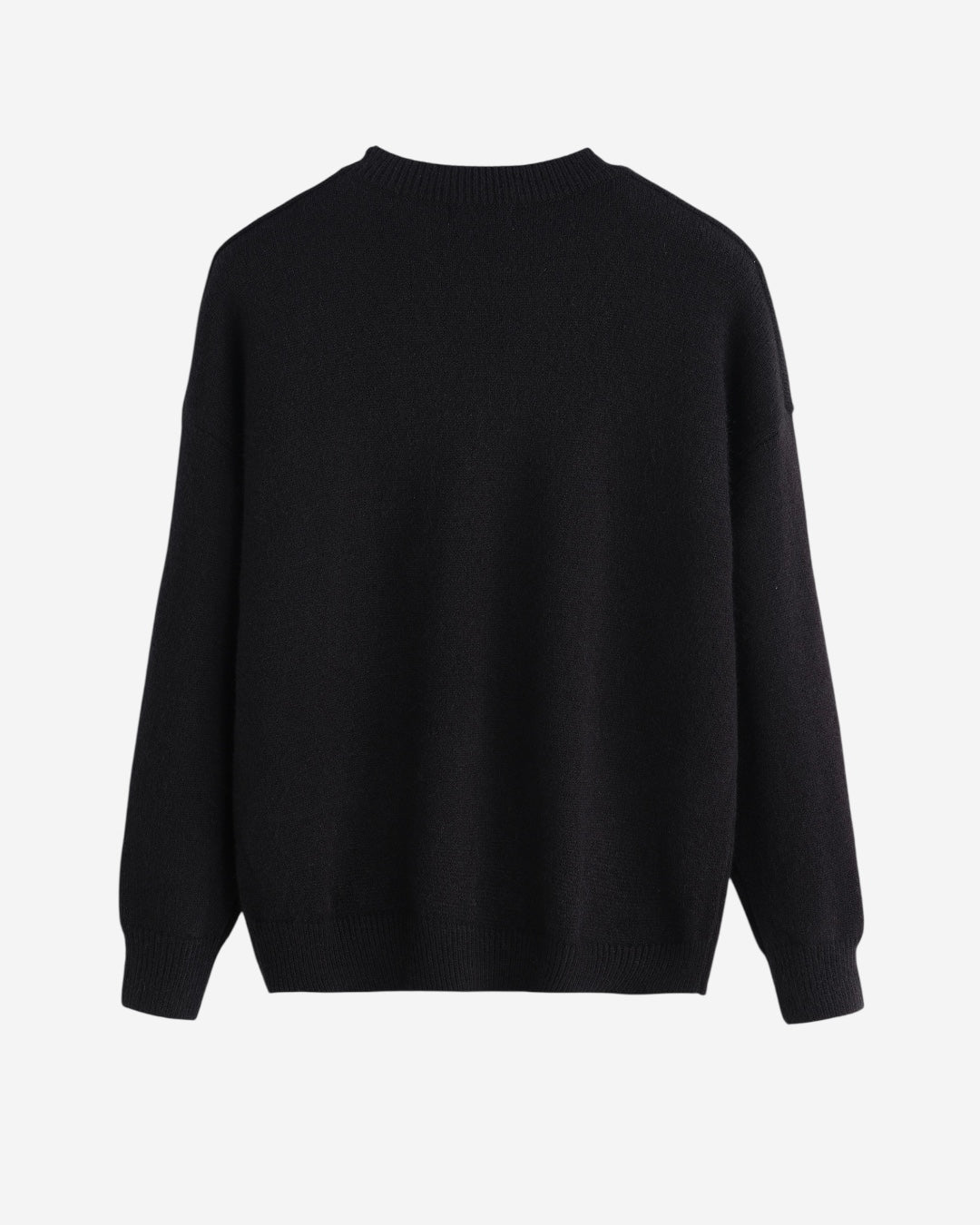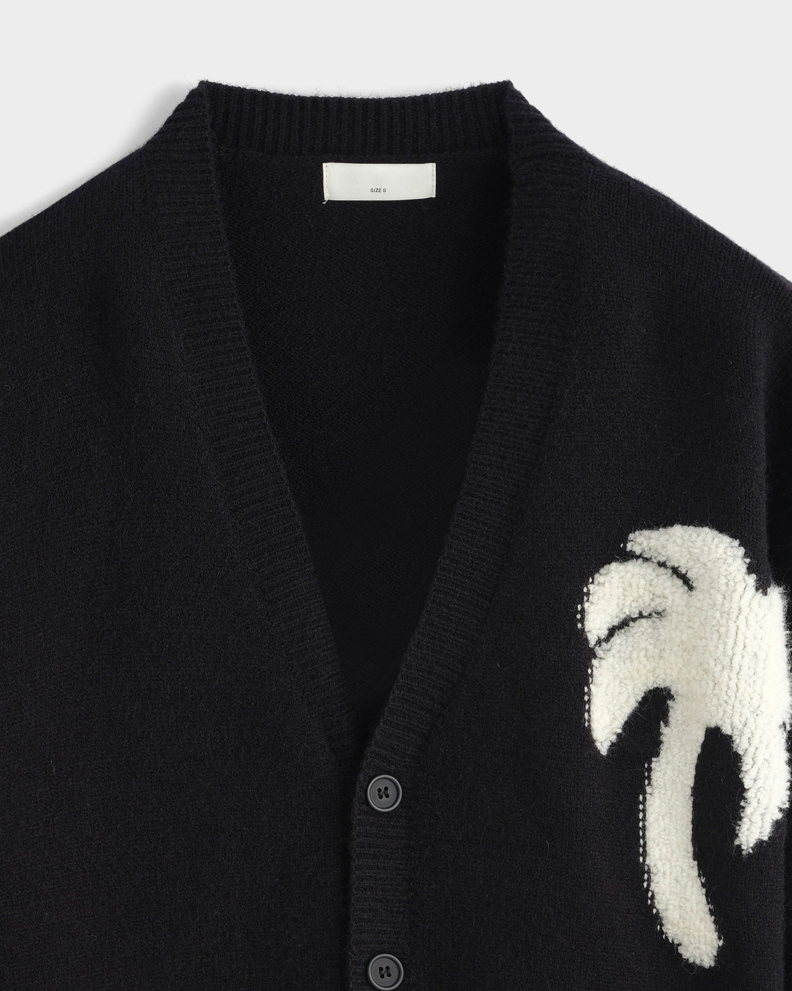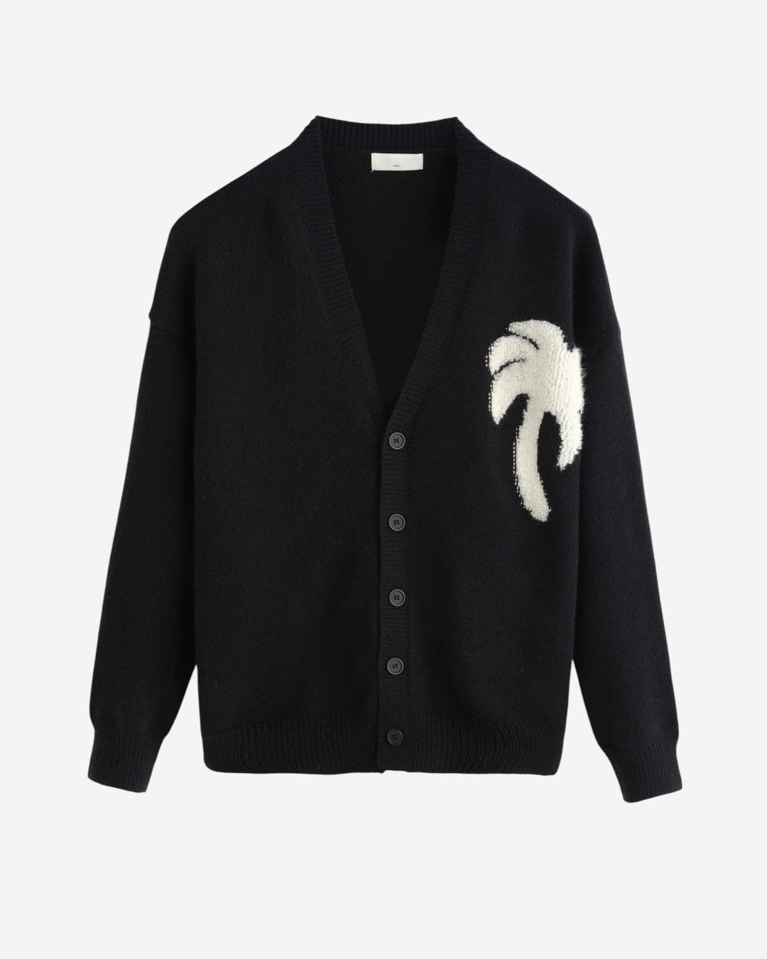 Cardigan dal design over in morbida maglia, caratterizzato da un fit rilassato e contemporaneo. Realizzato in filato misto caldo e confortevole, presenta una chiusura frontale con bottoni e scollo a V profondo. Il dettaglio distintivo è il motivo palma a contrasto sul petto, che aggiunge un tocco grafico e moderno al capo.