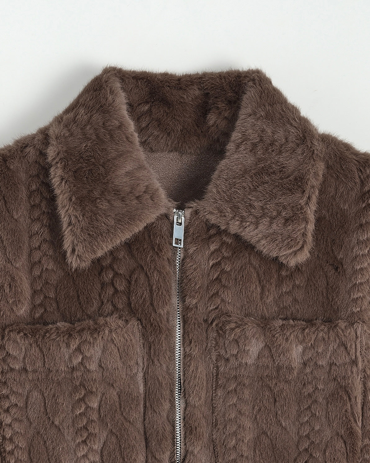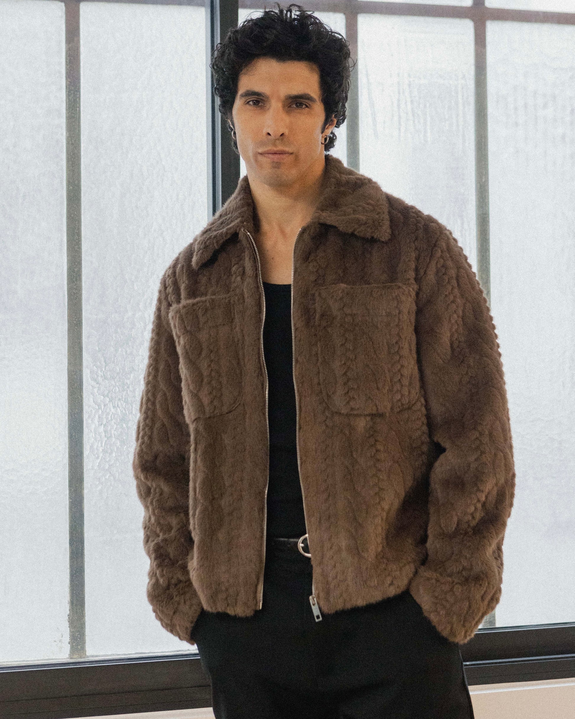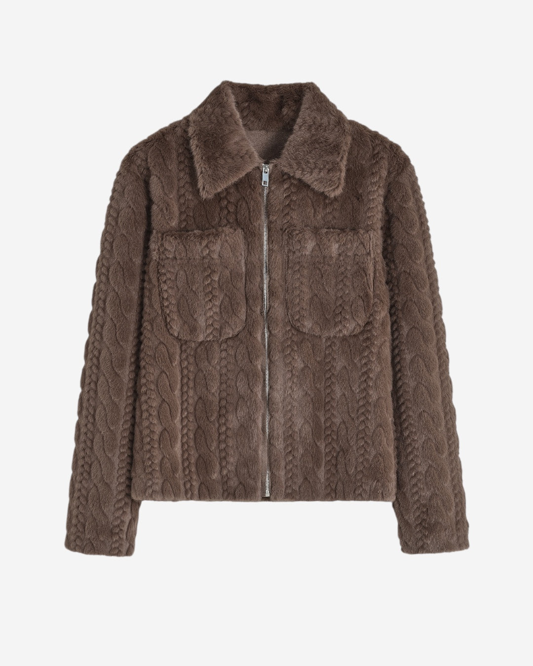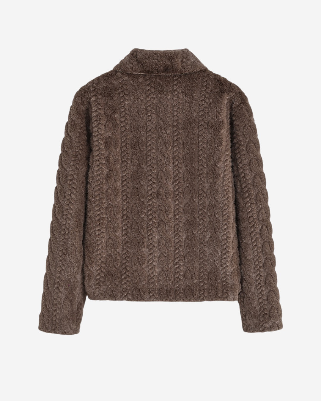Giacca in pelliccia sintetica dal design moderno e texture intrecciata effetto treccia. Morbida, calda e soffice al tatto, presenta una vestibilità regolare e una chiusura frontale con zip a doppio cursore. Il colletto classico e le due tasche applicate sul petto completano un look raffinato ma contemporaneo, perfetto per aggiungere personalità ai tuoi outfit autunnali e invernali.