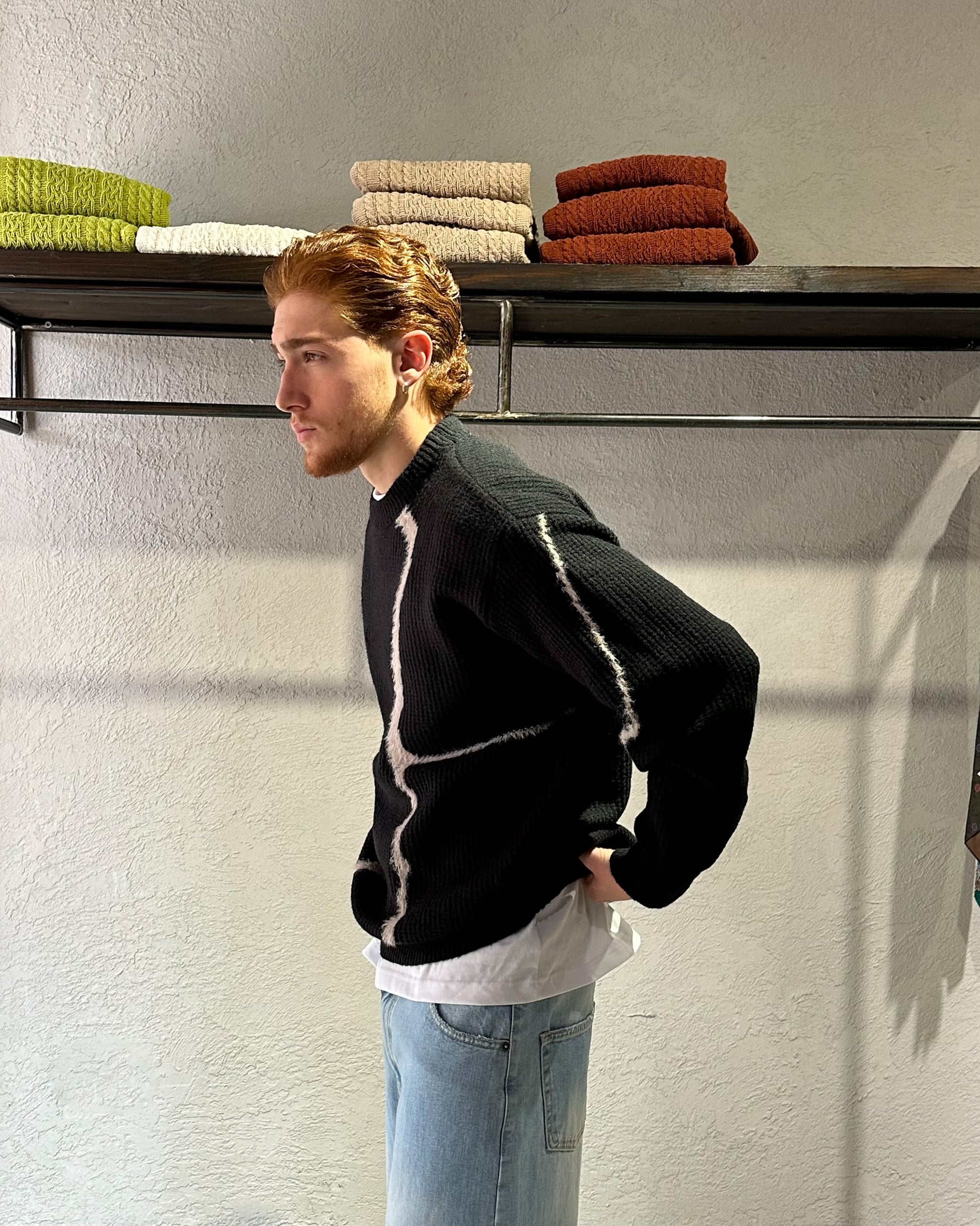 Maglione caratterizzato da una texture morbida e compatta con linee astratte a contrasto che creano un effetto moderno e distintivo.