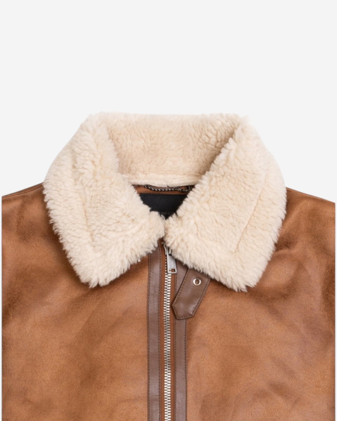 Il colletto largo, il bordo e i polsini rifiniti in pelliccia aggiungono carattere e struttura alla silhouette, mentre l’esterno in effetto pelle vintage dona un look deciso e moderno. Le fibbie laterali regolabili permettono di adattare la vestibilità, rendendo il capo funzionale oltre che esteticamente impeccabile.